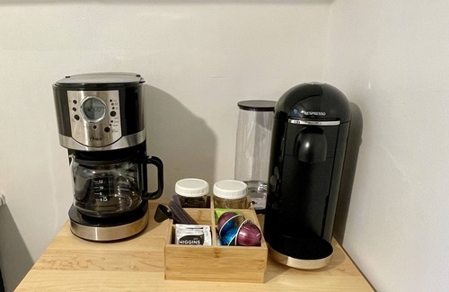 Functional living room with dedicated workspace with office essentials and lamp with usbs and plugs built in. Cozy electric fireplace with large 4K HD TV with every streaming service for free and cable. Comfortable memory foam sofa bed. Nice reading nook with books and boards games available. Functional kitchen with all essentials, Stove/Oven (convection), Nespresso and drip coffee, microwave, fridge/freezer, kettle, panini grill, rice cooker, pots pans, etc. Vintage bathroom with bathtub/shower and essentials like towels, soap, shampoo, conditioner.