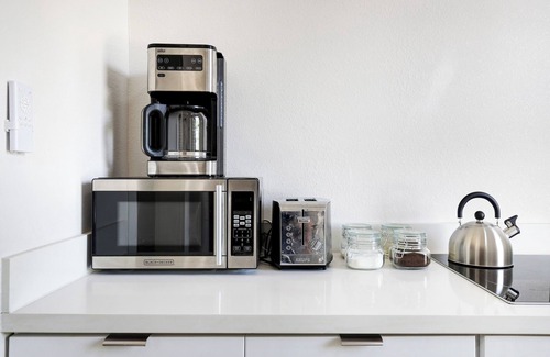 • Fully stocked kitchen + coffee bar