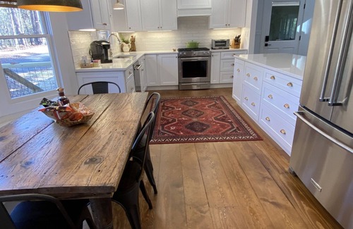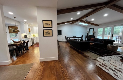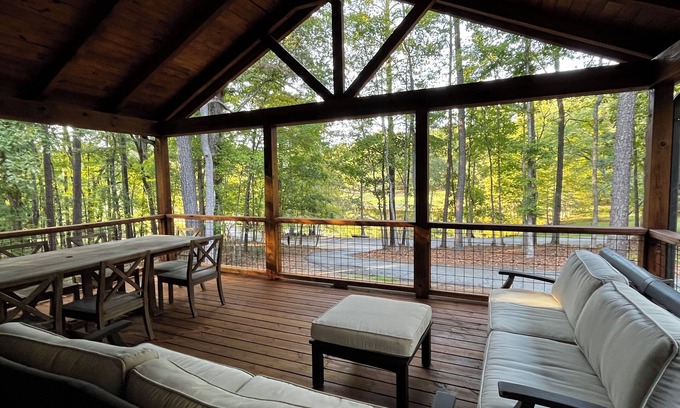 Forget your worries as you relax and unwind in this spacious and serene getaway. Tucked in the woods overlooking a large pond, you are sure to enjoy this newly remodeled, tranquil retreat with hardwood floors and tile throughout the entire home. Just a fifteen-minute drive to downtown or the stadium and under ten minutes to get to the UGA Vet School. There is a security gate to enter the property with your own code. Featuring an open-floor plan with three comfortably sized bedrooms and two full bathrooms, this home also features an enclosed study perfect for teleworking or enjoying some quiet time. The kitchen is stocked with basic necessities and overlooks the family room furnished with two large couches and a 65-inch smart TV. Gas logs are operated by remote control. Seating is plentiful inside this home with both bar seating and a six-person table in the kitchen and an eight-person table in the dining room. The newly built deck overlooks a large pond and is furnished with table seating for eight people along with two outdoor couches and a 55-inch smart TV for your outdoor entertainment.