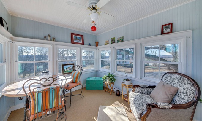 This bright, well-appointed Augusta home offers an idyllic getaway in the heart of the Missouri Rhineland! The 3-bedroom, 2-bathroom vacation rental features hardwood floors and wraparound windows overlooking the rolling hills. When you’re not enjoying the sunroom and covered front porch, go for a walk or ride on the Katy Trail, tour the numerous nearby vineyards and wineries, unwind in Klondike Park, and stroll past the glass studio, boutiques and historic streets in downtown Augusta.