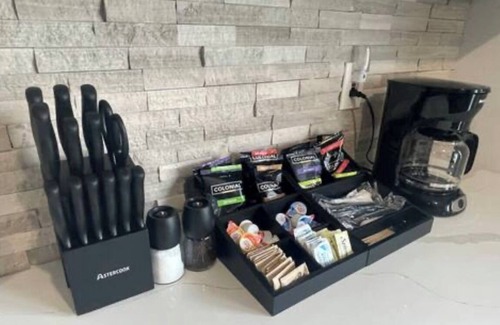 The apartment provides comfort with keyless entry, plush queen bed, massive 85" Smart TV, and high-speed internet for work or streaming. Thoughtful amenities include complimentary coffee/tea service and in-unit washer/dryer for your convenience.
