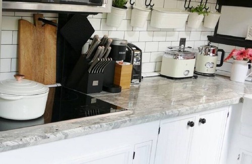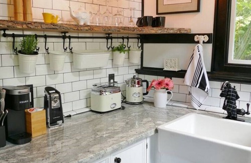 A cute kitchen is fully stocked with dishes and accessories for all your cooking needs. We'll leave the basics such as sugar, seasonings, cooking oil, coffee and tea to help you get started. A hand cut raw-edge wood bar with bar stools look out into the garden and provide a great spot for a relaxing meal. We also have convenient electronic charging at the bar and at the record player.