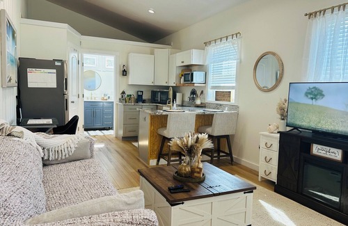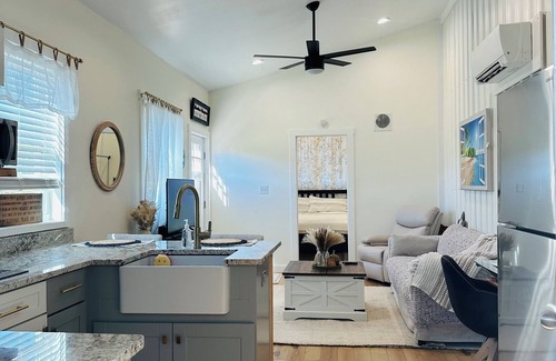 *It features, a fully stocked, equipped kitchen with a microwave, induction cook top stove, countertop oven, farmhouse sink, full size refrigerator with icemaker, coffee maker, and granite countertops. The kitchen island is offered for meals.