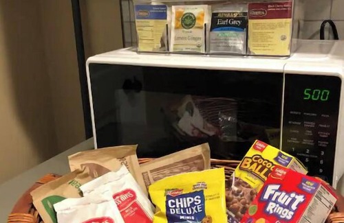 This studio suite has an open living and sleeping area, along with a private bathroom, and a fully appointed kitchenette with single serve coffee maker, toaster, tea kettle, and microwave.