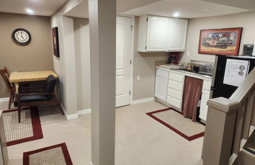This basement suite is newly finished, with a kitchenette, a cozy TV room, and a bedroom with a queen-size bed. The TV room has a futon that can be used as an extra bed.