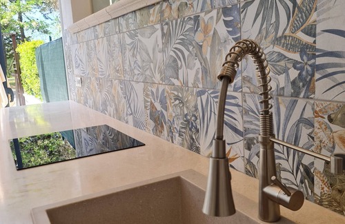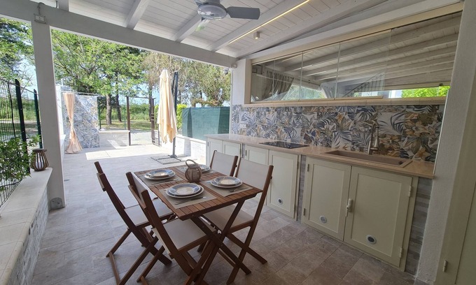 Among the included amenities, you will find a TV, air conditioning, washing machine, dishwasher, oven, and hairdryer, ensuring maximum comfort. Additionally, the house is equipped with mosquito nets and a security door for extra safety. The outdoor area is a true oasis of relaxation: a covered veranda with a white wooden roof, a wooden table, chairs, and a large umbrella will allow you to fully enjoy the beauty of the garden, where you can relax, read, or dine outdoors.