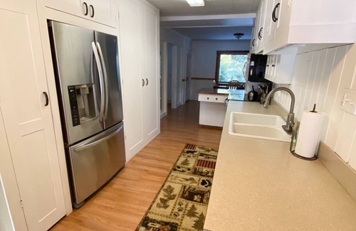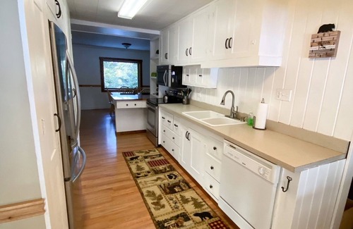 The house walks into a nice entryway with a bathroom that contains a washer, dryer, and shower stall. The cozy living room has an L shaped couch, 2 recliners, and a large TV with Netflix and a DVD player. From there you enter a full kitchen with a stove, microwave, dishwasher, refrigerator, and dining table that seats 6. The bedroom features a king size bed, dresser, closet and the second bedroom contains 3 twin beds with another twin in a common area. There is also a queen and 2 twin air mattresses complete with sheets and blankets in the hutch in the dining room. There are extra pillows, and also a pack-n-play with sheets and a fold up high chair stored in the master bedroom closet.