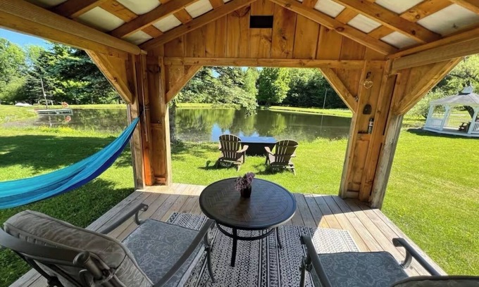 This small but marvelous one room plus porch cabin between 2 ponds, in East Meredith NY, is a cozy retreat for guests looking to unwind. It is a comfortable king bedroom, WiFi, AC, TV, microwave, coffee station and a hair dryer, this charming property has everything you need for a pleasant stay. The separate but private inside full bathroom/shower/laundry is a few steps away from the cabin (paved path). The peaceful surroundings and convenient amenities make it a tremendous choice for your vacation. You're sure to make fantastic memories with a stay at our place.