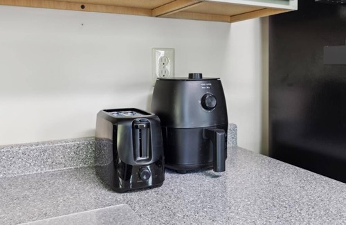 KITCHEN: Fully stocked coffee & tea bar W/ Keurig Machine. Includes Amazon brand variety pods and green tea. Table seating 4. Set of 4 glass plates & bowls. Kids plastic ware is available.