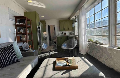 Welcome to our much-loved desert cabin! This is an original 1958 pink brick cabin with with lots of modern upgrades for a comfortable and cozy getaway. Black and white marble tile floors, small 575 square foot cabin with big views on our 5 acre property.
