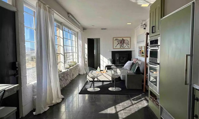 Big desert views in Johnson Valley. Feels off-grid but with comfortable amenities, natural light throughout. 1950s pink brick cabin with modern updates. 5 min to KOH, 18 min to Landers, 40 min to Joshua Tree Park entrance.