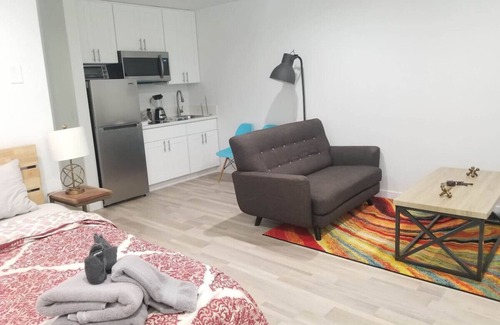 Enter into the studio via the private entrance and you'll have the living room area to your right with a comfy couch and a TV with streaming Roku (Netflix included!). To the left is a queen bed with a dresser and a large closet. Near the back of the room is the brand new kitchenette fully equipped with a 2 burner cooktop, fridge, and microwave. Toaster oven and coffee maker are also included. There is a full private bathroom for you as well. outside is a shared patio area with a table that has a n ocean view!
