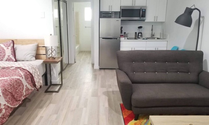 Bright and comfortable Studio, 10 seconds from the sand! You're literally just steps away from the sand on a quiet stretch of the Marina Peninsula. Enjoy the beach life in your modern and clean, recently remodeled studio apartment. The apartment has everying you need from a fully equipped kitchenette to a comfy queen bed and living room area with streaming TV! Free parking space included!