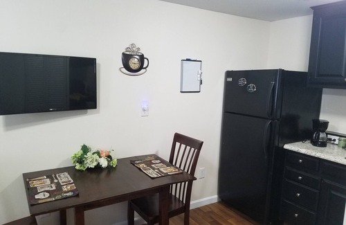 Relax in this charming, fully furnished one-bedroom suite with a private entrance and fenced courtyard. The full-sized kitchen is fully equipped — just bring your groceries and luggage! Enjoy dining for two, TVs with Roku in both the bedroom and living area, and the convenience of an in-unit washer and dryer. Your perfect beach retreat awaits!