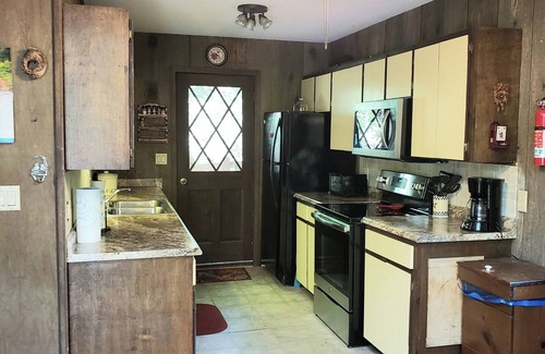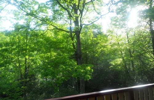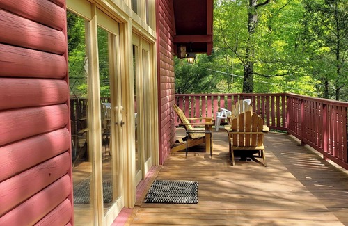 October Hill is 3 levels, with a bedroom and full bathroom on each level. The huge family room has hardwood floors, a rock fireplace with gas logs, 25 foot vaulted ceiling and lots of glass to enjoy the beautiful views. A large deck wraps around the cabin for outside dining and relaxing. A charcoal grill is provided. There is plenty of parking with a circular driveway. A security device is mounted on the exterior front porch of the cabin.