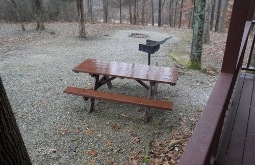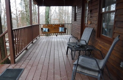 Cabin has a covered deck with a porch swing, picnic table and a private fire ring.