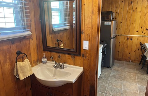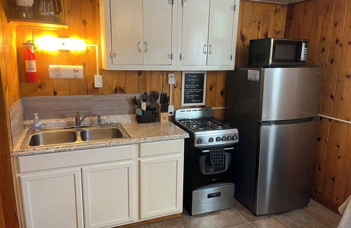 The cabin features comfortable sleeping arrangements including one queen bed, one full-size bed, and a full-size futon, ensuring everyone has a cozy space to retreat to after the festivities. A fully equipped kitchen allows for easy meal preparation, and the open-concept design fosters a warm, communal feel. Stay connected with fiber optic wi-fi and unwind in the living area with the smart TV (streaming services included). You'll also find a private bath for convenience, plus access to a communal outdoor dining area complete with picnic tables and grills, perfect for hosting post-wedding brunch or casual gatherings.