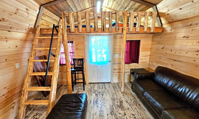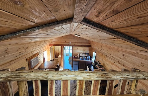 This is a cozy little cabin just 8 minutes from the Ark. It has a loft with two twin beds, and a bedroom with vaulted ceiling and queen bed. It has a full kitchen (with all dishes included), as well as a full bathroom. Note that the wide angle lens used to capture the images of the inside of the cabin make it look slightly larger than it is.
