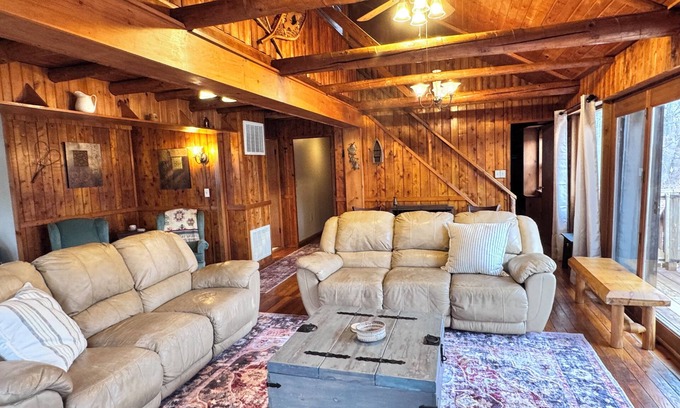 The extensive use of wood finishes throughout the cabin emits a cozy and eclectic feel. The living area is open and accommodates group leisure time and gathering. A dedicated office space is ready for those working remotely. Along with the first and second floor bedrooms, the loft space offers an additional sleeping area with a full bed. The first floor bathroom features a large jetted jacuzzi tub for relaxation and a first floor washer and dryer is available for convenience. A dog run off the deck offers your furry friends a space of their own, while keeping them safe.