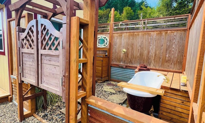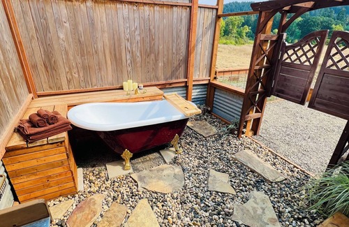 Enjoy the lovely setting of this completely seperate and private romantic spot in nature. Nestled in a beautiful valley on a 32 acre pristine farm in Oregons wine country. Take a walk to enjoy the animals or simply sit by the creek on the property. Or stay cozied up in a brand newly built off grid cabin, full with an outdoor bath and shower, kitchenette and toilet. Short distance away from several amazing outdoor recreational activities.Just miles from many local wineries. Shuttle services can be provided upon request as an add on. This is a rustic off-grid tiny home experience for those looking for a romantic and unique getaway in nature. The cabin is small but cozy, with a king size luxurious bed and a full home movie theatre style projector and popcorn maker. The bathroom and kitchenette are located outside of the cabin and are covered and private. This is a perfect place to unwind, decompress, and spend quality time with a significant other. Farm fresh eggs can be available upon request. If you have any questions about our amenities of facilities please reach out to us!