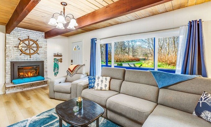 Within walking distance of both the quiet town of Copalis Beach and the ocean, this home is sure to help you unwind on beach time. The first floor of this cozy cabin features a gas burning stove downstairs to warm up a chilly evening, an overstuffed sofa to nestle into, plus a small dining area and kitchen with a green forest view.