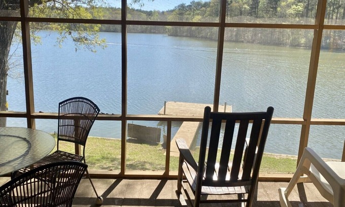 Located on almost flat private lot with fenced in yard. All kitchen amenities. Near Wind Creek State Park (2 miles by water), 50 minutes from Montgomery 1 hour from Birmingham 45 minutes from Auburn,50 minutes from Talladega race track and 8 minutes from Alexander City. Super Walmart 8.5 miles. Boat ramp ( 1 block ),several great restaurants within about seven minutes.Why rent a condo when you can have your own private floating swim pier with beautiful clear deep water( great fishing or any water activities)you can see sunrise across lake or sit on the large screened in porch over looking the lake,while drinking coffee or while tending to the onsite grill. Looking for quiet,peaceful getaway vacation this is it. no smoking no pets inside.