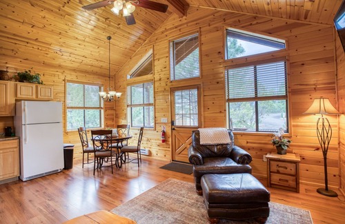 Take a break and unwind at this cozy cabin for two with stone fireplace and private spa. The "Talking Rain" cabin is part of the Mogollon Resort near Bison Ranch in Heber-Overgaard, AZ. A great place to get away from your busy life and enjoy the cooler weather, mountains, and ponderosa pine trees.