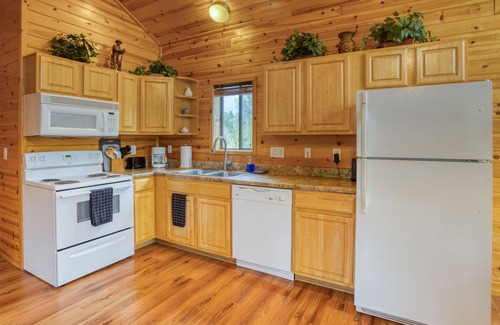 This cabin has a large, open living area/full kitchen/dining. The living room has a propane fireplace, cozy leather furniture, a 65" smart TV where you can log into your streaming services, and a DVD player. There is a full size kitchen with dishes/cookware for your use. The bathroom is large with a tub/shower combo, plus large sink area. A stacking washer/dryer is in the closet. The bedroom has a brand new king size bed with a Nectar memory foam mattress, and the private hot tub is on the deck just off the bedroom. Wall A/C unit is there if needed.