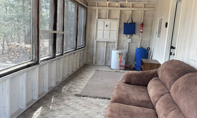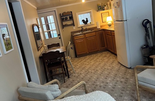 Two open room spaces with twin beds in both rooms and a living room turned into another sleeping space for your family of 6! Fans provided. Too late to book a hotel…no worries! Enjoy a campfire outside your door after the kids are tucked in or just want to relax in the porch. A nice time away from television! We are not far from public boat launches and could accommodate a small boat trailer on the property if notified ahead. No lake access at the property. You will be sure to unwind in the peaceful atmosphere. Full size refrigerator, a toaster, coffee maker, frying pan and a microwave are the kitchen appliances available.