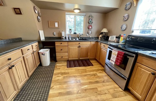 The kitchen is stocked with all the appliances you could need for your stay. It includes a freestanding electric range, K-Cup coffee maker, coffee bean grinder, drip coffee maker, toaster, full-size refrigerator, and all the cutlery and dinnerware you will need. Grilling on the deck is also a great cooking option which is provided via a Weber propane grill.