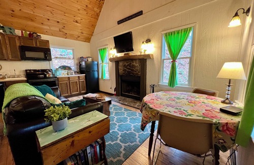 Tucked away behind the trees on the side of a mountain. 1 BR with a loft used as the 2nd BR and 1 full bath. Wrap around covered porch with porch swing, fire pit, picnic table, and moss covered bridge.
