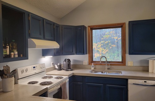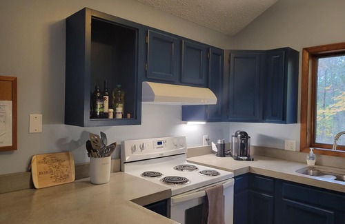 The property has been renovated with the comfort of guests in mind. Throughout the process, our goal was to make this cabin in the woods feel like a home away from home: where friends could come and relax for a few days or a few weeks. Brand-new, comfortable furniture with plenty of seating allows for everyone to gather around to eat a great meal, play games, or warm up by the outdoor fire ring. The open-concept kitchen and island make it easy to prepare meals while laughing with the group or keeping your eye on the game.