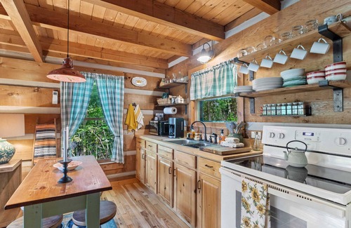 Warm wood interiors and appealing mountain décor create an inviting atmosphere inside this mountain cabin. The main area is an open floor plan with a living room with a leather couch and comfy seating around a large Smart TV. This room leads into the dining area for 4 and the well-stocked kitchen.