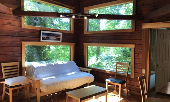 With a large scenic window view of the valley below the cabin gives the feeling of being outside as well as great for viewing birds.