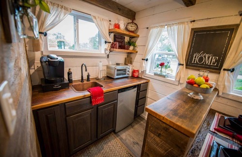 This cozy, rustic tiny house, paneled inside and out with 100-year-old barnwood, will make you feel you've stepped into a cabin from another century. Hammered copper sinks and light fixtures and a handmade rocking chair along with WiFi, A/C and TV make this one-of-a-kind place complete for any modern traveler. Only 12 minutes from Magnolia Silos and Baylor University. NOTE: The bedroom is accessed by a steep ship's-ladder style stairway.