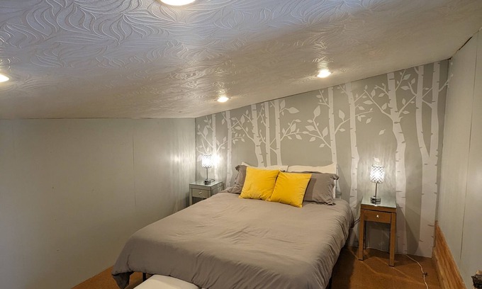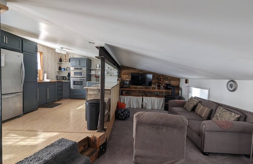 This cabin apartment loft is roomy and comfortable. It is stocked with many amenities and has lots of unique touches you wont find just anywhere. Complete with granite counter tops and full-size efficient kitchen. The giant soaking tub is a favorite and does have a European shower. It has 2 bedrooms that make plenty of space for folks to spread out.