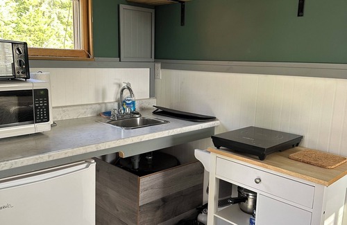 Cabin comes with microwave, toaster oven, induction hot plate, small griddle/grill, pots and pans, coffee maker, kettle, bar fridge with small freeze, cutlery, bowls/plates and a BBQ for grilling. The cabin has a TV and DVD player. (No cable) but does have WiFi.
