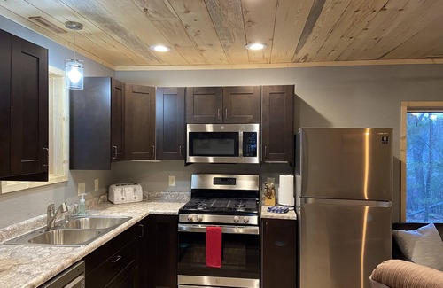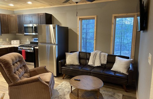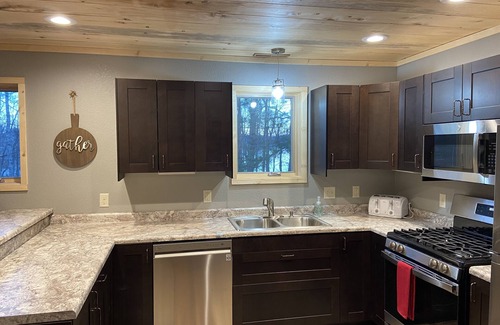 Full kitchen with brand new appliances - Microwave, stove, fridge and dishwasher. Kitchen includes dishes, cups, silverware, pans, utensils, kitchen and dishcloths. There is also a beautiful view of the lake from the kitchen. Living room area has a pullout futon couch, comfy chair and flat screen smart tv.