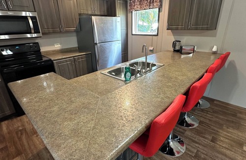everything is brand new, the cabin is brand new and there is parking for 1 car. Also there is a marina with a ramp for boats to the lake and a nice dock for boat docking with additional charge