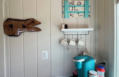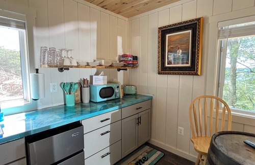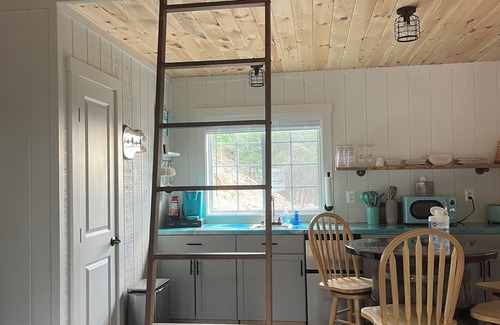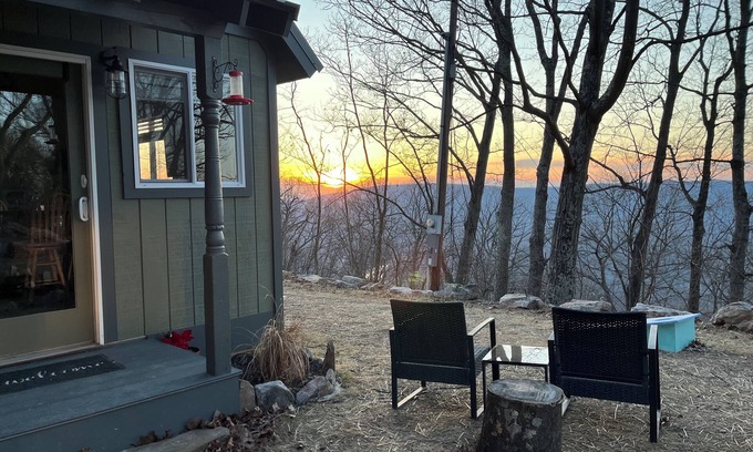 Adorable, Soo Cute, and Just Right! Unique Space. You’re on top of a mountain, surrounded by nature & fresh air. Small open space with a loft, bathroom, & kitchenette. Custom built by the owner, master builder, with turquoise counters & accessories which give a cool & relaxing Vibe. Berkeley Springs (Civilization) is just 30 minutes away. Enjoy card & dice games, horseshoes, birdwatching, stargazing, hiking or just simply being in this relaxing space. Places to sit and picnic outdoors. Nice fire pit for making s’mores and singing campfire songs. This cabin sits below Hawk’s Nest, Cozy Cabin’s big sister. Winter View of Rivera d valley. PET Fee for your furry friend. Please include him/her when booking your stay. No dogs over 50 lbs. only one pet is allowed. Rough ROAD the last two miles. Closest grocery is 30 minutes away. CAMERAS-3 still life cameras along the driveway and 1 live camera above the front door. Guests may unplug module (next to door) upon arrival. Please select “travelers” when booking, to add pets and additional guests.
