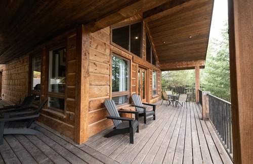 A rustic cabin capable of housing up to 8 travelers spread across 2 bedrooms (one equipped witha king bed and two twin beds, and the other witha king bed and a queen bed). Also find 2 full bathrooms, a fully equipped kitchen, a living room with a flat-screen television, and a private deck area (equipped with a private hot tub, seating areas, and a gas grill).