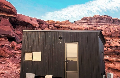 Nestled at the base of Redrock cliffs on a remote private ranch in Moab, is our Cozy Cabin Tiny Home. Our modern cabin has an en-suite bathroom with toilet and shower, kitchenette, comfortable bed and a work space. Outside you'll find a sitting area, fire pit and countless stars. Designed to be the perfect modern and rustic retreat for rest, inspiration, discovery and adventure. Reconnect with nature at this unforgettable escape.