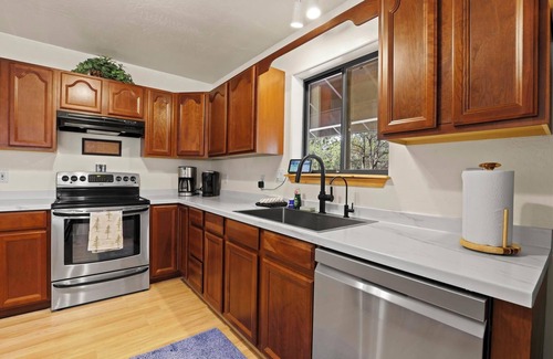 -Stocked kitchen with cookware, utensils & family dining essentials