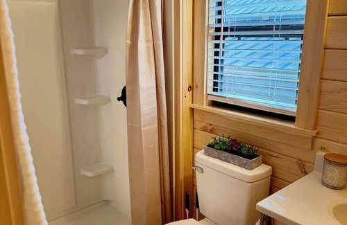 The primary bedroom features a comfortable queen-sized bed, while two twin bunk beds are located in the hallway. For extra sleeping arrangements, head up to the loft, which contains two additional twin beds for a cozy retreat. The cabin also includes a bathroom with a stand-up shower for your convenience.The kitchen is well-equipped with all the essentials, including a cooktop, microwave, refrigerator, cooking utensils, and a coffee maker and toaster.