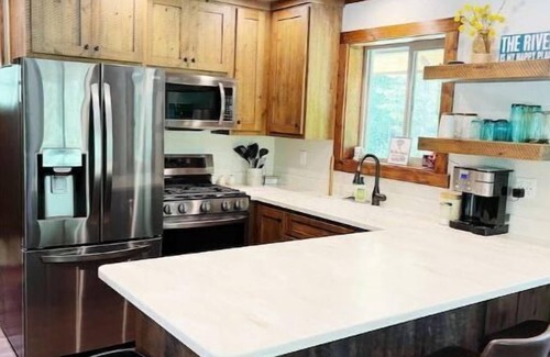 The cabin is equipped with full kitchen with all the necessary equipment to prepare meals. Kitchen bar with seating and dinning room with table that seats 6. Living room has a comfortable couch, chair, 42 inch smart tv, and a freestanding gas fireplace. No need to fuss with messy firewood. Just click on and enjoy.