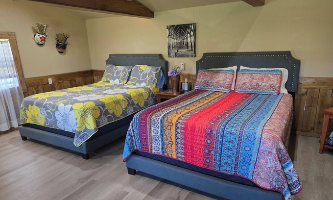 Escape to a pleasant cabin retreat in Watkins Glen. This cozy 1-bedroom cabin features 2 comfortable queen beds, AC, WiFi, and a relaxing shower. This cabin along with your bathroom are marked #1 on the door. Both doors are painted orange.