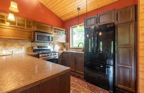 The Qu INN is surrounded by towering mountains and pristine wilderness. Inside, the cabin is warm and inviting, with a fireplace as the centerpiece of the main living area. The cabin has large windows that offer stunning views of the mountains. The cabin also has a fully equipped kitchen and comfortable bedroom (1 queen bed) and one loft (1 queen bed) that can accommodate a family or a group of friends. A perfect place to unwind and reconnect with nature.