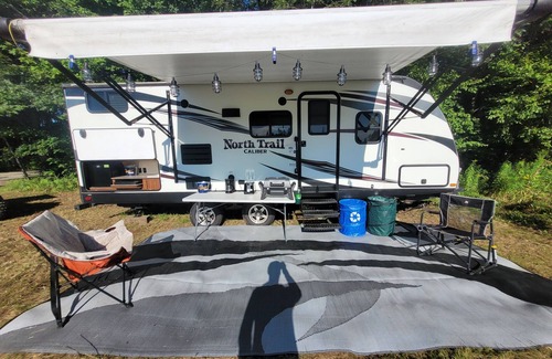 The camper is equipped with an indoor and outdoor fridge, indoor and outdoor gas stove top, microwave, coffee pot, toaster, Roku TV (Will need to hotspot off your phone to utilize the smart TV), small outside gas grill and griddle, fire pit, and chairs. Included with your stay: sheets and pillows, cooking utensils, paper plates, plastic silverware and cups, coffee mugs, bottled water, toilet paper, body wash, shampoo, conditioner, hair dryer, paper towel, towels, chairs, outdoor table, fire pit, and firewood. Bean bag boards and mountain bikes may be available as well.
