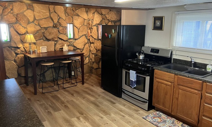 The property is in the middle of town. There are 2 comfortable chairs on the porch where guests can enjoy the evenings / mornings. The kitchen has all major appliances, coffee maker, microwave, blender, and a dining set to accommodate up to 6 people.