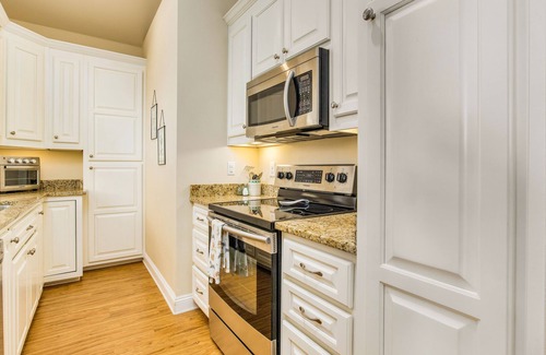 The primary bedroom has a queen-sized bed with closet space to hang your clothes, a dresser, nightstands, and an ensuite bathroom. The bathroom has accessibility features of walk-in shower, shower seat, and grab bars. The is also a large soaking tub.